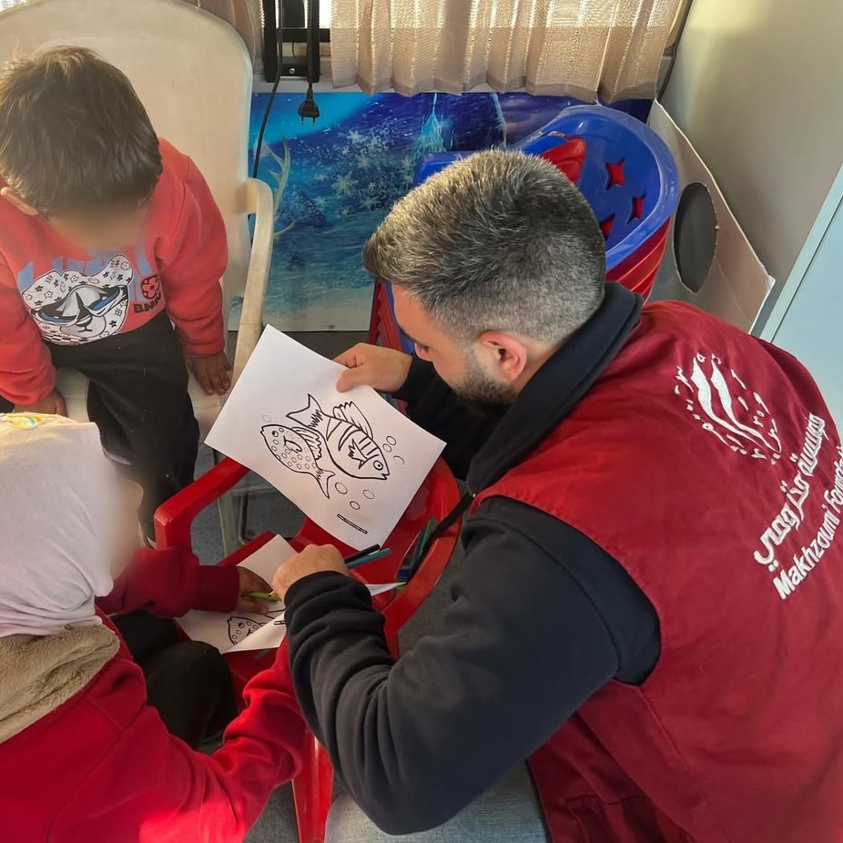 Because protecting children and supporting their mental health is a priority in every humanitarian response, Makhzoumi Foundation teams began implementing psychosocial support activities for children from displaced families in the Sports City. Through entertainment sessions and drawing and coloring activities, they are helped to express their feelings and regain moments of tranquility despite difficult circumstances. These activities aim to create a safe space for children to interact, play, and alleviate the effects of stress and anxiety, as part of the Foundation’s ongoing efforts to support displaced families.